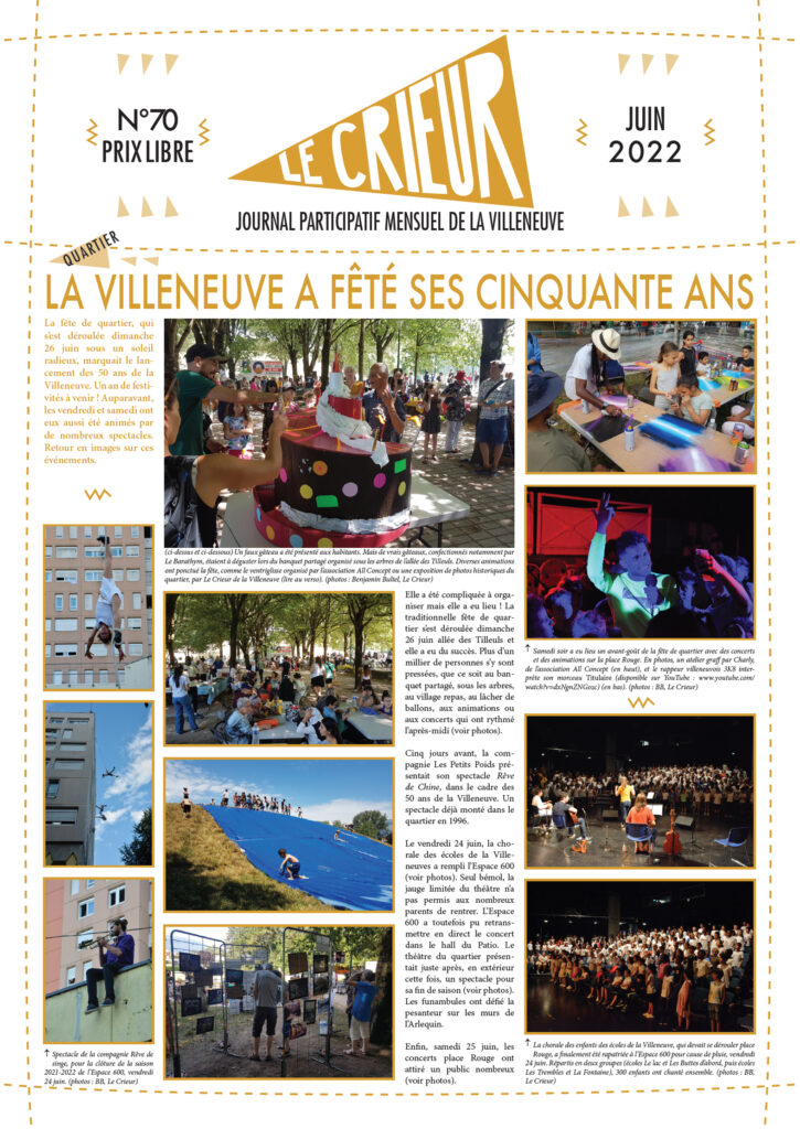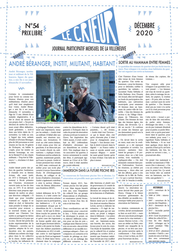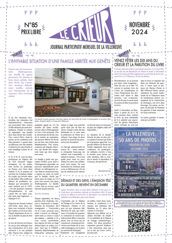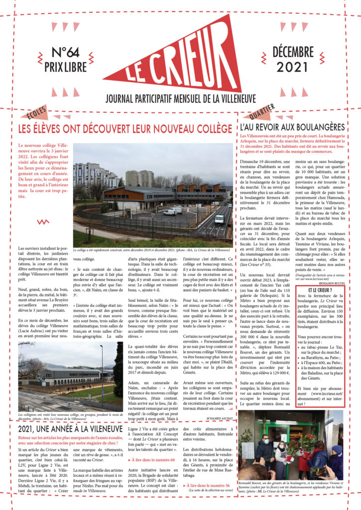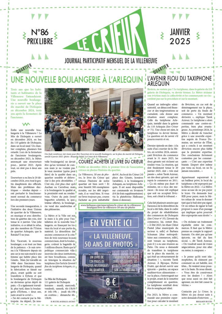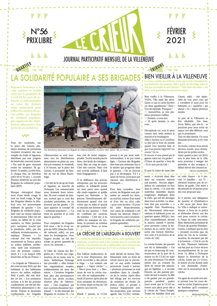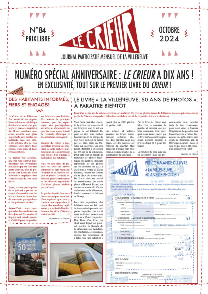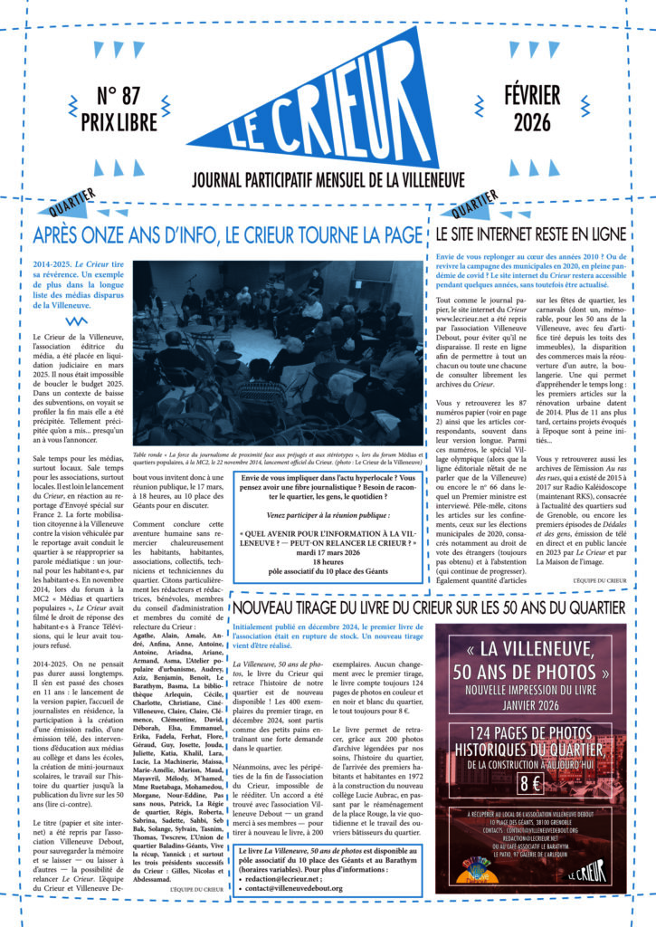 La version mensuelle du Crieur de la Villeneuve a été publiée de janvier 2015 à février 2026. Elle était disponible tous les mois (sauf en juillet et en août) dans le quartier.
