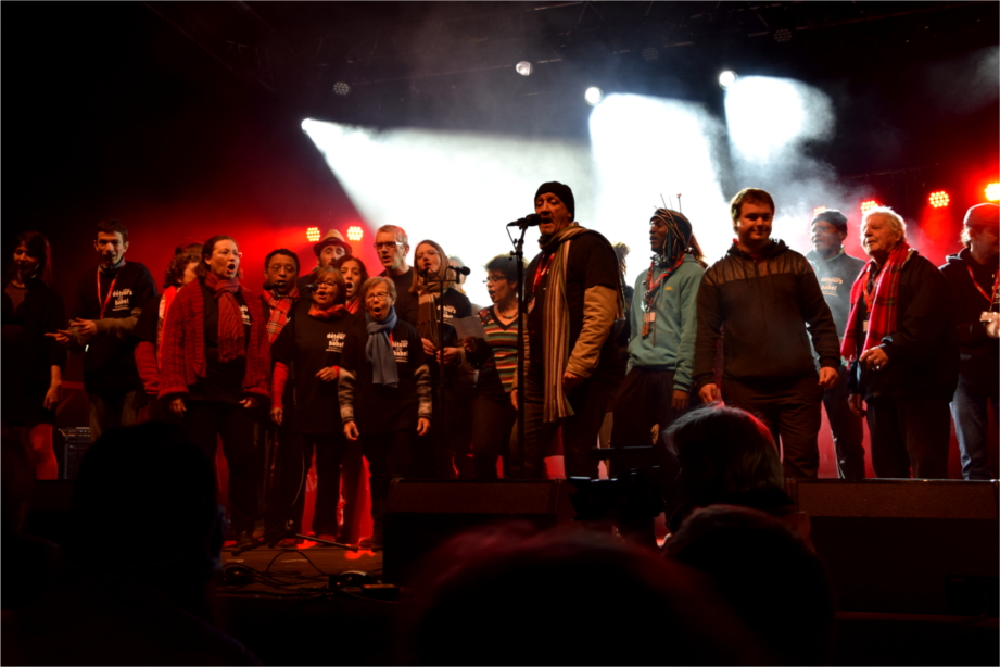 Les habitants se congratulent, admirent les illustrations du livret, vérifient l’orthographe de leur nom. Beaucoup ne se connaissaient pas avant de monter sur scène mais, à voir la franche camaraderie qui règne entre eux, ils ressemblent plus à un groupe habitué à écumer les concerts sur les routes.