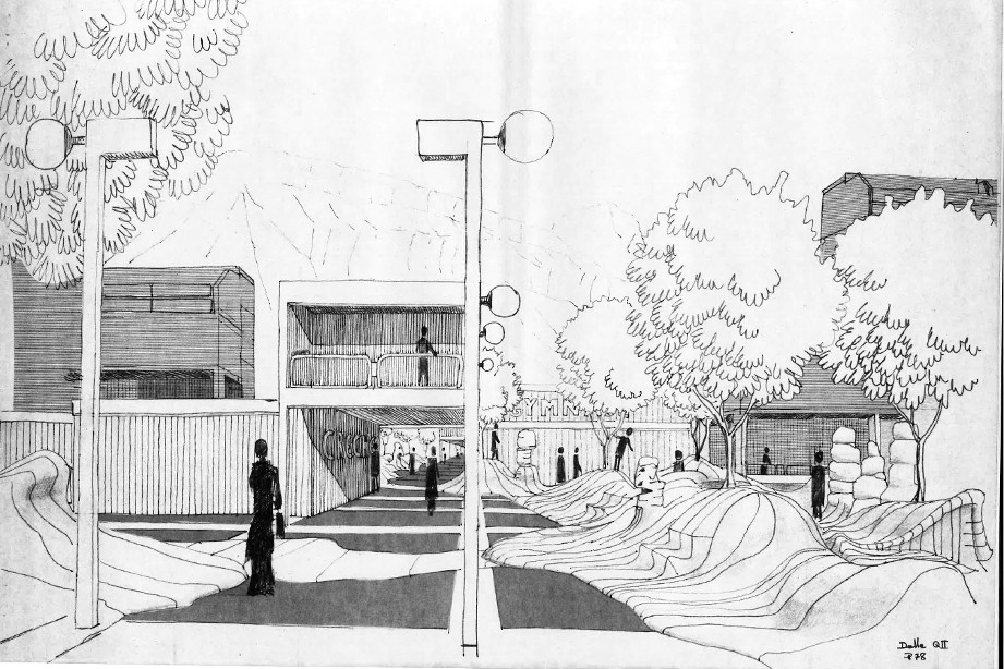 Dans les grandes lignes, le plan-masse des Baladins, est déjà arrêté en mai 1975. Les architectes se retrouvent avec une immense dalle (200 mètres par 40, plus la future place des Saules) à décorer. À l’inverse de l’Arlequin, dont la décoration des espaces et des équipements publics commence à peine à l’époque, l’idée est de mener en parallèle la construction de la place et des logements et la décoration des espaces publics.